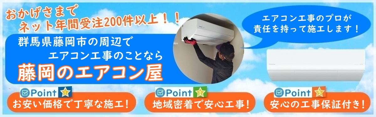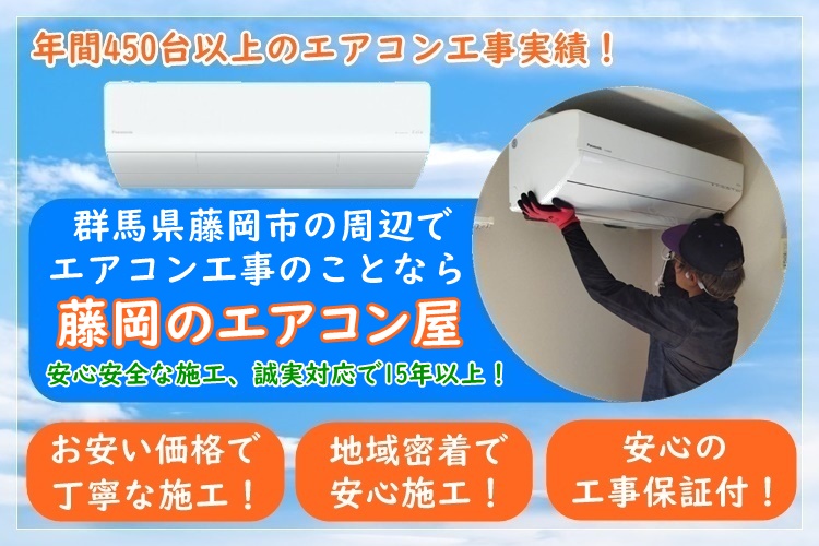 藤岡のエアコン屋は家庭用のエアコン工事を主にエアコン取り付け・取り外し工事をおこなっている地域密着のエアコン業者で、藤岡市を中心に群馬県で活動しております。